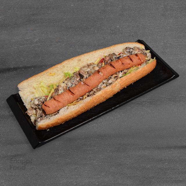 خمیر مخصوص استرامبولی، دونر گوشت، قارچ بلانچ، پنیر ورقه ای دودی، سس سیر مخصوص، کنجد