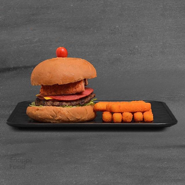 ۱۳۰ گرم سینه مرغ سوخاری نرمال آغشته به سس بوفالو مخصوص چیکن من، کاهو، گوجه، نان برگر، دورچین: سیب زمینی سرخ کرده، به همراه یک عدد نوشابه قوطی و یک عدد سس کچاپ یک نفره